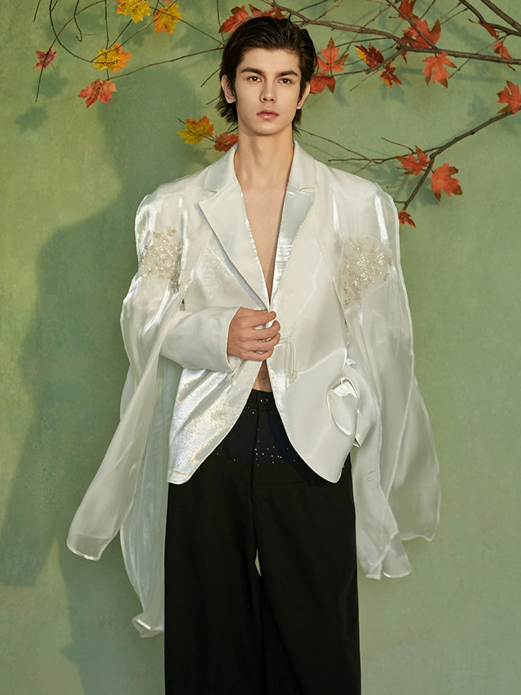 The blazer redefines casual sophistication with its loose, relaxed fit and pristine white hue. Drawing inspiration from traditional Chinese aesthetics, this blazer offers a refined yet effortless look ideal for seamless transitions between day and evening wear. Its breathable fabric and thoughtful tailoring ensure comfort while maintaining an elegant silhouette, making it an essential piece for a distinguished wardrobe.