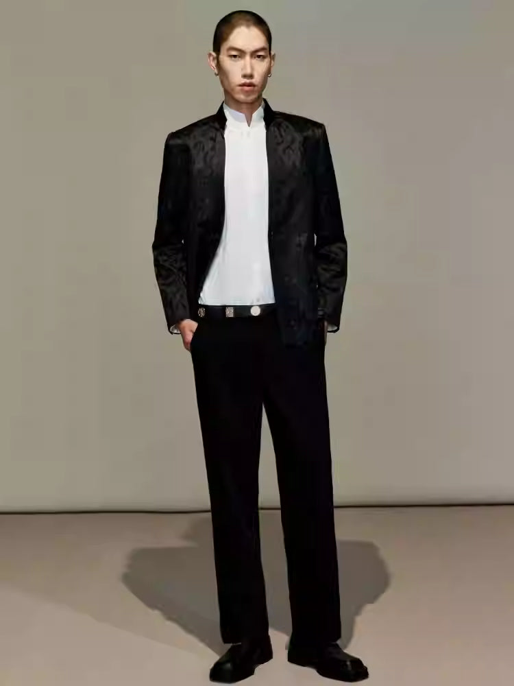 Elevate your wardrobe with the Honeysuckle Jacquard Stand Collar Coat. Crafted with intricate jacquard fabric, this coat combines refined texture and visual depth, offering both style and sophistication. The stand collar and V-neck design create a sharp silhouette that enhances any outfit, while its expert tailoring ensures a polished, comfortable fit suitable for professional and upscale settings. This coat is an excellent choice for those seeking a distinctive, expertly crafted outerwear piece that seamlessly blends classic elements with modern elegance.